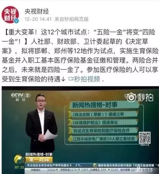 01、重磅!五險將變?yōu)樗碾U 早在2016年,國務(wù)院就對重慶、內(nèi)江、昆明、岳陽、鄭州、威海、合肥、泰州、沈陽、邯鄲、晉中這12個城市進(jìn)行試點(diǎn),實(shí)施生育保險并入醫(yī)療保險基金征繳和管理,試點(diǎn)時間為:2年。