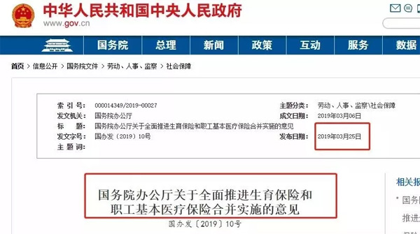2019年3月月15日,國務(wù)院正式發(fā)布《關(guān)于全面推進(jìn)生育保險和職工基本醫(yī)療保險合并實(shí)施的意見》(國辦發(fā)〔2019〕10號),意見指出,2019年底前實(shí)現(xiàn)兩項保險合并實(shí)施。