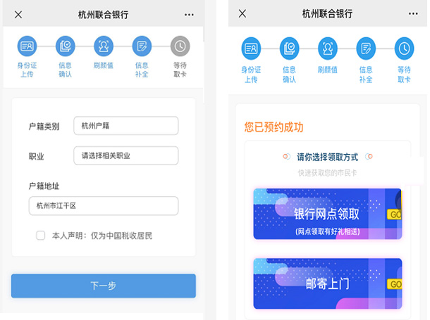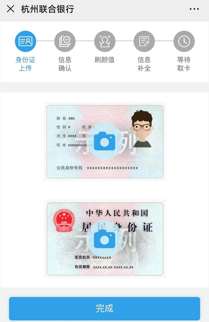 此二維碼由杭州聯合銀行提供,安全可靠, 信息只有銀行系統可以看到,請大家放心掃碼! 02、上傳身份證,完成人臉識別確認身份