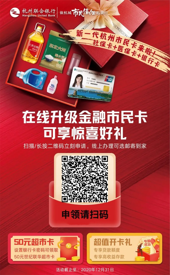 04、銀行確認信息完成制卡,電話通知領取 05、攜帶相關證件前往營業廳領取激活市民卡,領取50元超市卡福利 溫馨提示: 1、填寫個人信息時,市民卡的領取方式一定要選擇自取,不要選擇郵寄,以便激活及領取獎品福利 2、填寫個人信息時,選擇自己就近的杭州聯合銀行,方便領卡和激活 3、老市民卡用戶領卡激活時請攜帶身份證原件、原市民卡原件,以便合并公交卡等功能; 4、新辦卡用戶領卡激活石請攜帶身份證原件。 現在怎么辦理激活市民卡 如何領取50元超市卡福利 大家都清楚了吧! 最后讓小編跟大家科普一下 升級市民卡到底有什么好處? 什么是升級市民卡,有什么好處? 1、市民卡一定要升級嗎? 根據社保局《關于人力資源社會保障部辦公廳在養老保險工作中全面推進社會保障卡應用的通知》(人社廳發【2019】13號)相關規定,逐步將職工基本養老保險、城鄉居民基本養老保險待遇變更在與社會保障卡(市民卡)相關聯的銀行賬戶中發放。 2、二代市民卡添加金融功能 二代市民卡在一代的基礎上添加金融功能。它不僅是一張市民卡,還是一張借記卡,免年費、工本費、銀聯跨行ATM取現手續費、電子銀行轉賬手續費等。 辦理新卡后,老卡的醫療保險、錢包、智慧醫療結算等均轉至新卡。且新卡領取前,原市民卡已開通的醫療保險、錢包等不受影響,可以繼續使用。 3、升級后功能更加完善 新卡除了老卡原有的圖書館、公園卡、寺廟卡、校園健身、電子錢包、智慧醫療等功能之外,新添更多金融功能,包括: a、出行優惠:銀行賬戶綁定手機支付,不定期享受乘坐地鐵、公交優惠折扣! b、采用電子芯片全程保護,安全性更佳 需要升級的小伙伴快來參加哦~ 全體小伙伴都可通過此次仁本專屬二維碼 參與免費升級,領取50元超市卡哦!