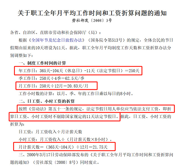 二、職工全年月平均工作時間和工資折算(新算法): 1、制度工作時間的計算 (1)年工作日:365天-104天(休息日)-13天(法定節(jié)假日)=248天 (2)季工作日:248天÷4季=62天/季 (3)月工作日:248天÷12月=20.67天/月 (4)工作小時數(shù)的計算:以月、季、年的工作日乘以每日的8小時 2、日工資、小時工資的折算 按照《勞動法》第五十一條的規(guī)定,法定節(jié)假日用人單位應當依法支付工資,即折算日工資、小時工資時不剔除國家規(guī)定的13天法定節(jié)假日。據(jù)此,日工資、小時工資的折算為: (1)日工資:月工資收入÷月計薪天數(shù) (2)小時工資:月工資收入÷(月計薪天數(shù)×8小時) (3)月計薪天數(shù)=(365天-104天)÷12月=21.75天 可以看到的是,月工資計算天數(shù)沒有變化。 加班工資計算 依據(jù)《工資支付暫行規(guī)定》第十三條:用人單位在勞動者完成勞動定額或規(guī)定的工作任務后,根據(jù)實際需要安排勞動者在法定標準工作時間以外工作的,應按以下標準支付工資: (一)安排勞動者延長平日工作時間的,支付勞動者工資的150%的工資報酬; (二)休息日安排勞動者工作又不能安排補休的,支付勞動者工資的200%的工資報酬; (三)法定休假日安排勞動者工作的,支付勞動者工資的300%的工資報酬。 目前現(xiàn)行算法是: 加班工資=月薪÷21.75×加班天數(shù)×所對應的倍數(shù) 以上“工資”指的是勞動合同所簽訂的總額,如果勞動合同的工資分為“基本工資”、“崗位工資”、“職務工資”等,應當以各項工資的總和作為基數(shù)計發(fā)加班費(包含獎金、津貼、補貼等),不能以單獨一項作為計算基數(shù)。 |