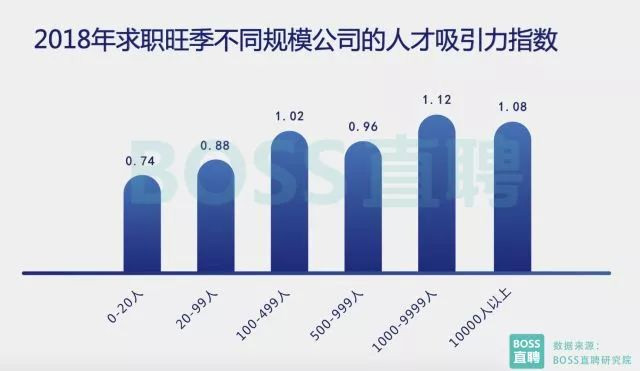從求職者期望薪資的角度觀察,2018年前兩個月,全國50城求職者平均期望薪酬為9051元,同比增長3.3%。 期望月薪在1萬元以上的求職者比例從2017年的27.3%升至28.4%;期望月薪在2萬元以上的求職者比例上升0.2個百分點(diǎn)至6.5%,而期望月薪不足5000元的求職者比例同比下降1.6個百分點(diǎn)。 人才求職心態(tài)趨穩(wěn) 中小企業(yè)加薪搶人 BOSS直聘研究院發(fā)現(xiàn),在2018年跳槽旺季,1000-9999人規(guī)模的公司由于發(fā)展穩(wěn)定系數(shù)高,且應(yīng)聘難度及競爭壓力略低于萬人大廠,最受求職者歡迎。相比之下,中小企業(yè)在這個旺季依然面臨人才難求的困境。 100人以下的初創(chuàng)企業(yè),人才吸引力不足0.9,大幅低于千人以上公司,20人以下的初創(chuàng)企業(yè)人才吸引力僅為0.74,反映出在近幾年競爭趨于白熱化,各細(xì)分領(lǐng)域排位逐漸清晰,資本集中向頭部企業(yè)傾斜的環(huán)境下,人才整體求職心態(tài)更趨于穩(wěn)定。