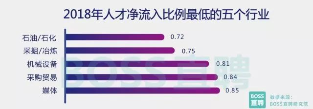 在新興行業(yè)沖擊下,傳統(tǒng)行業(yè)正在面臨愈發(fā)嚴(yán)峻的人才危機(jī)。BOSS直聘研究院數(shù)據(jù)顯示,以能源/化工為代 表的部分傳統(tǒng)行業(yè),人才凈流出比例正逐漸走高。 這種情況的出現(xiàn),一方面與部分傳統(tǒng)行業(yè)集中去產(chǎn)能和自動 化水平升級,導(dǎo)致崗位需求下降有關(guān),另一方面也與新興行業(yè)表現(xiàn)強(qiáng)勢,人才吸引力超過傳統(tǒng)行業(yè)有很大關(guān)系。