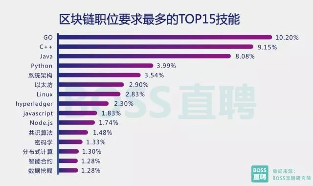 4、區(qū)塊鏈相關(guān)崗位的技能要求 BOSS直聘研究院發(fā)現(xiàn),超過80%的區(qū)塊鏈相關(guān)職位對求職者的技能要求在3項(xiàng)及以上,技術(shù)類人才除了需掌 握常用開發(fā)語言外(C++,Java,Go),還需要對密碼學(xué)、共識算法、超級賬本、智能合約等有足夠了解。