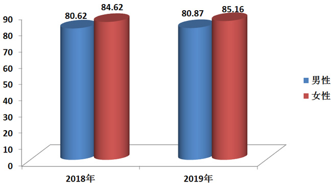 杭州市男性、女性人均期望壽命有差別,差距有所擴大。其中2019年全市男性人均期望壽命為80.87歲,女性85.16歲,比2018年分別增加0.25歲和0.54歲。男女人均期望壽命差距為4.29歲,比2018年4歲差距擴大了0.29歲。 重大慢性病過早死亡率為7.20%