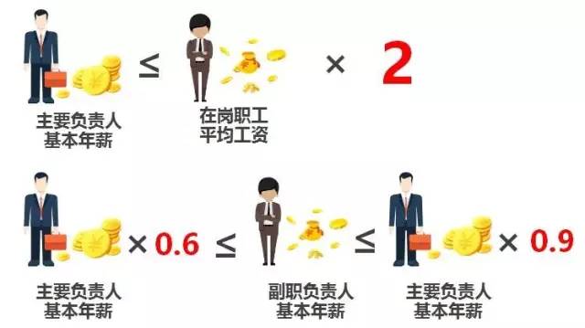 主要負責人的基本年薪在上年度市管企業在崗職工平均工資的2倍以內確定;副職負責人的基本年薪按本企業主要負責人基本年薪的0.6至0.9倍確定。