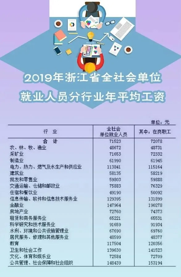 近日,浙江省統計局發布《2019年浙江省全社會單位就業人員年平均工資統計公報》。 2019年,浙江省全社會單位就業人員年平均工資為71523元,比上年增加5625元,增長8.5%,扣除價格因素增長5.4%。