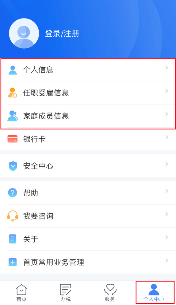 2、登錄個(gè)人所得稅APP打開個(gè)人所得稅APP 后顯示首頁頁面,點(diǎn)擊【個(gè)人中心】-【登錄/注冊(cè)】,可憑注冊(cè)的手機(jī)號(hào)碼/證件號(hào)碼作為賬號(hào)進(jìn)行登錄。