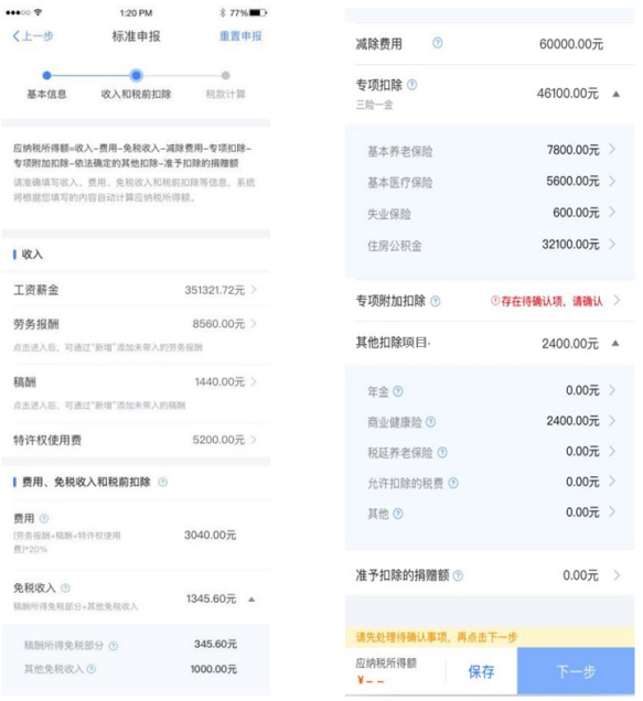 ③住房租金和住房貸款利息專項(xiàng)附加扣除不能同時(shí)享受,如果系統(tǒng)里兩項(xiàng)同時(shí)存在,需要選擇確認(rèn)其中一項(xiàng)。 ④如果有商業(yè)健康險(xiǎn)、稅收遞延養(yǎng)老保險(xiǎn),可以在其他扣除明細(xì)列表界面,進(jìn)行新增和修改。 ?、萑绻?020年度有捐贈(zèng)支出,可以在準(zhǔn)予扣除的捐贈(zèng)額列表界面,進(jìn)行新增和修改。 (3)繳納稅款或申請(qǐng)退稅①若2020年度收入不足 12 萬元且有應(yīng)補(bǔ)稅額,或者收入超出 12 萬元但應(yīng)補(bǔ)稅額≤400 元,申報(bào)提交后無需繳款。 ?、谌舸嬖趹?yīng)補(bǔ)稅額但不符合免于申報(bào),可點(diǎn)擊【立即繳稅】,根據(jù)提示完成支付即可。