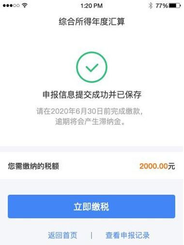 若暫不繳款可以選擇【返回首頁】或【查看申報(bào)記錄】, 后續(xù)可再次進(jìn)行繳款。注意:需要在2020年6月30日前完成繳款,逾期會(huì)有滯納金的。 ?、廴舸嬖诙嗬U稅款,可點(diǎn)擊【申請(qǐng)退稅】,選擇銀行卡后提交退稅申請(qǐng),錢會(huì)打進(jìn)你選擇的銀行卡里。