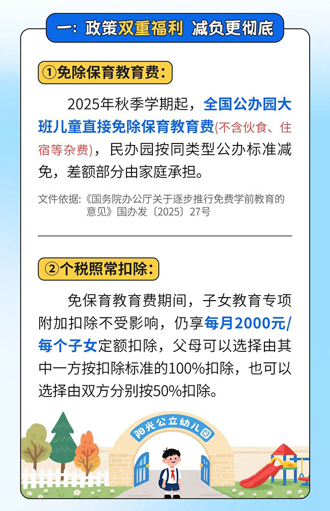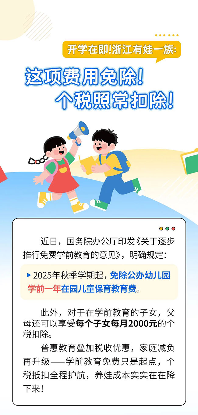 開學(xué)在即,浙江有娃一族注意啦,2025年秋季學(xué)期起,公辦幼兒園學(xué)前一年在園兒童,保育教育費(fèi)將免除,但個(gè)稅將照常扣除!具體內(nèi)容,一起來看: